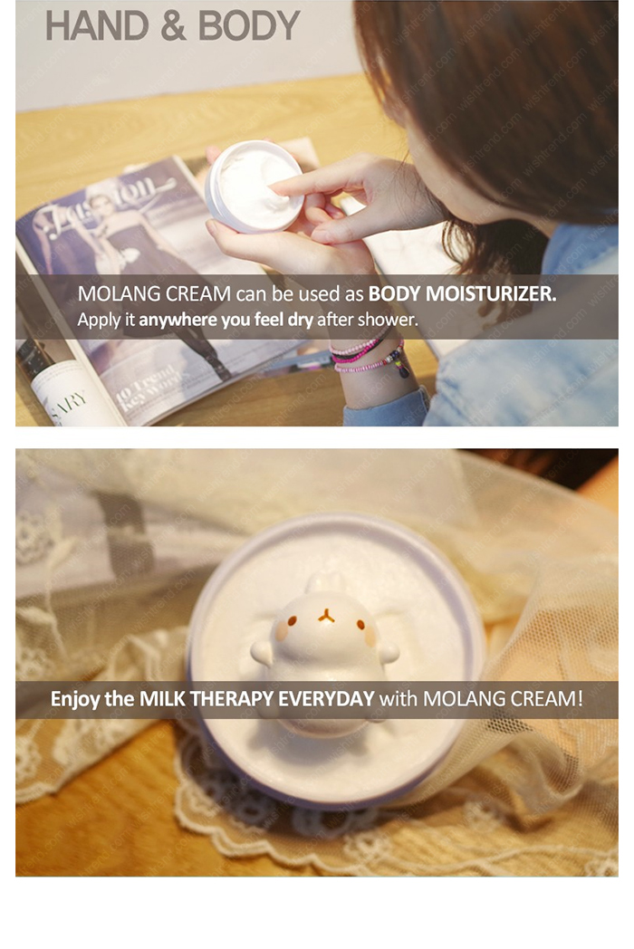 Molang cream là sản phẩm hot của hãng Chica Y Chico Hàn Quốc với sự kết hợp giữa sữa và kem tươi với thành phần nguyên chất sữa tươi từ new zealand, sữa non và vanilla, cùng 8 loại trái cây cung cấp vitamin cần thiết nhất cho da (măng cụt, chuối, dứa, ổi, xoài, đu đủ, chôm chôm, quả noni/quả nhàu).
